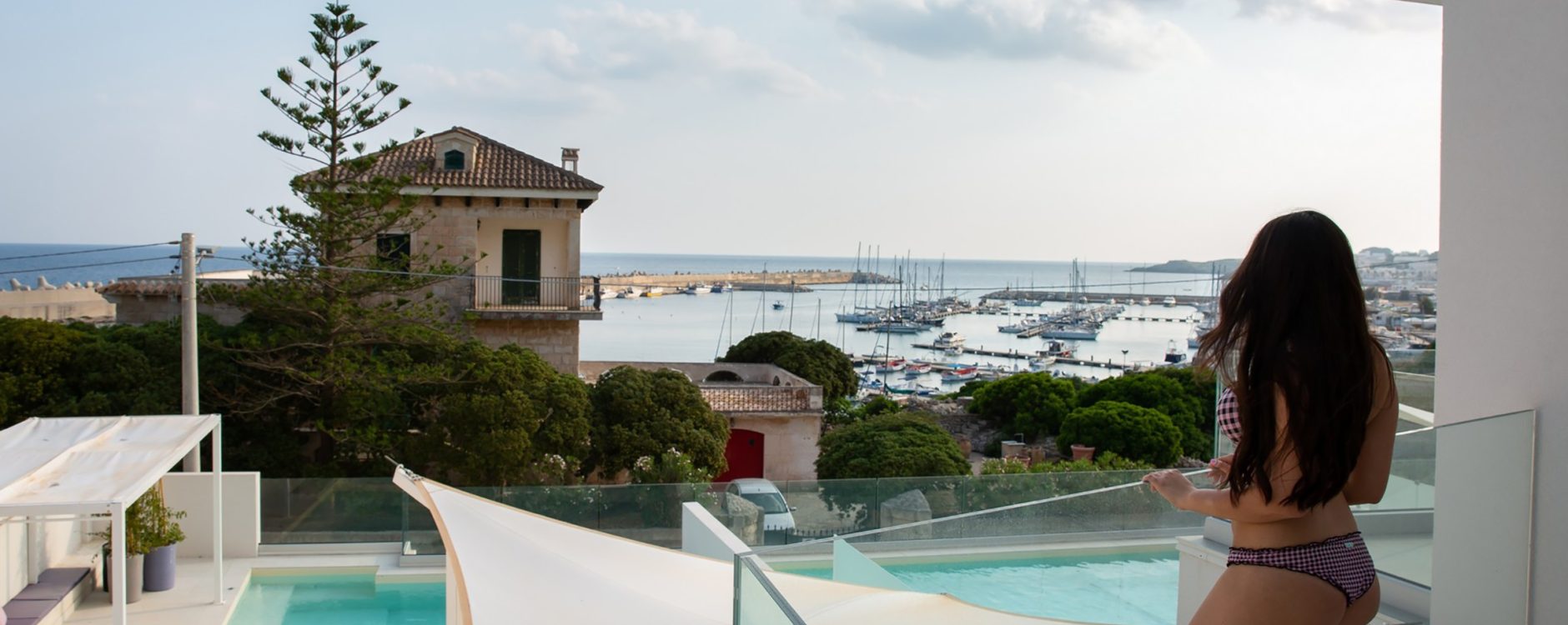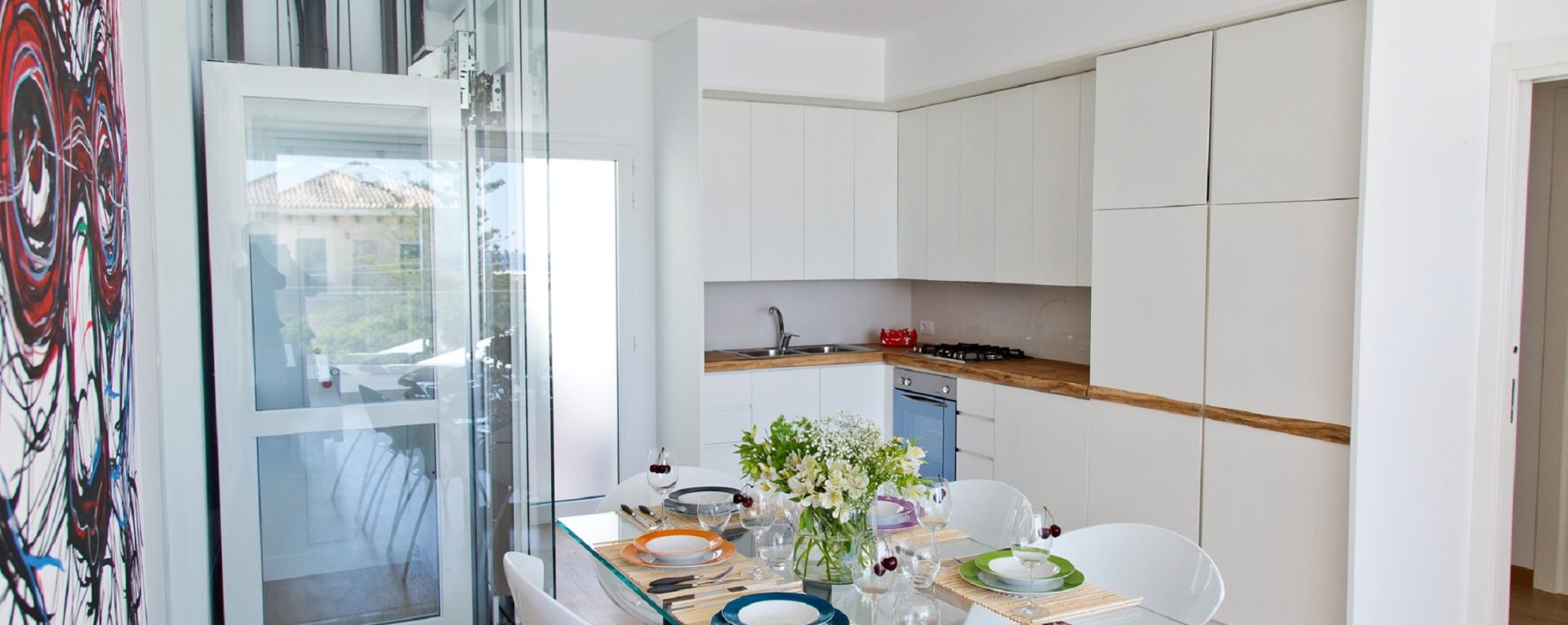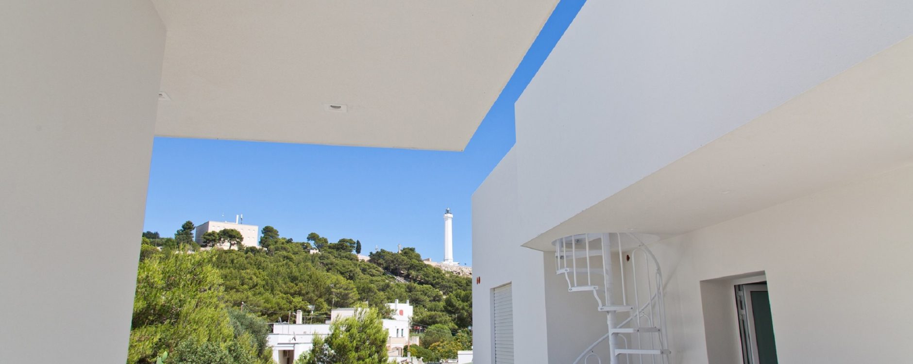 Consisting of 2 double bedrooms, a bathroom, and a spacious living area with sea view, equipped with a fully fitted kitchenette. The living room and the master bedroom overlook the bay of Leuca and enjoy a breathtaking view, as does the solarium, which is accessible via a private elevator inside the house. The solarium is equipped with a canopy, sun loungers, and a private mini pool of the infinity jacuzzi type overlooking the horizon.
